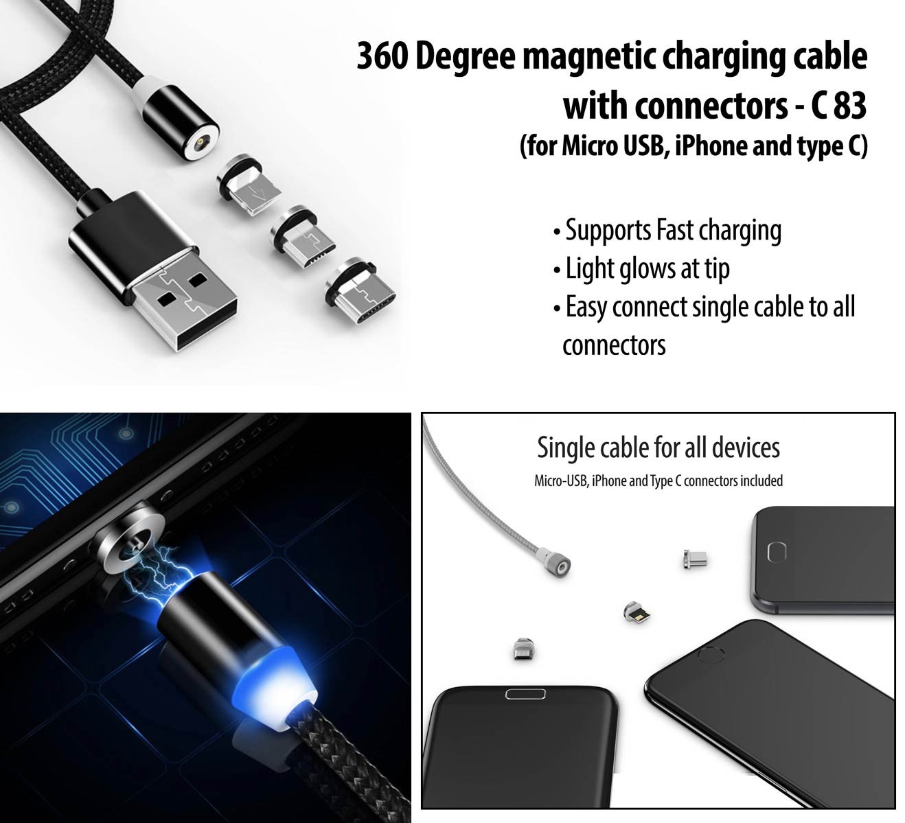 360 Degree magnetic charging cable with connectors | Supports Fast charging | Light glow at tip (for Micro USB, iPhone and type C)